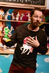 “In clever Fool-ish style, beautifully inaugurating the prolific company’s new home at the Lillian, James and Delilah’s sadly claustrophobic little home workroom is brought to glorious life by DeAnne Millais’s whimsically cramped set, impressively complemented by propmistress Lisa Anne Nicolai’s massive collections of candles brought home from Delilah’s part-time job at the mall, as well as the kind of other kitsch sold in the pages of TV Guide, and, of course, piles and piles of lonely-looking ceramic unicorns.”
